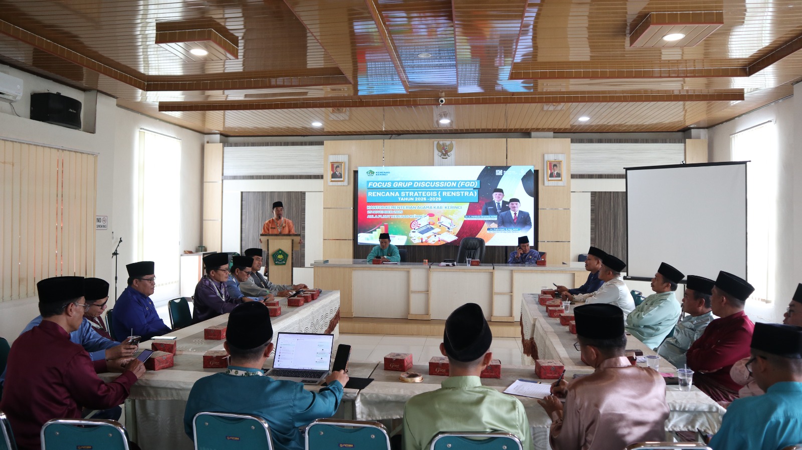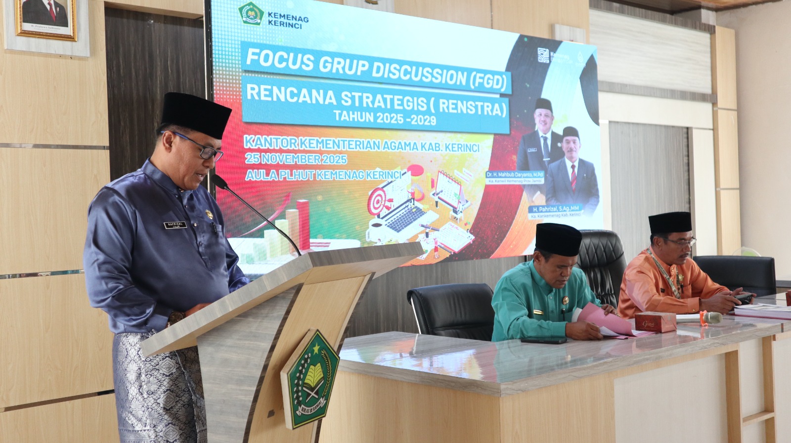 Kemenag Kerinci (Humas) – Kepala Kantor Kementerian Agama Kabupaten Kerinci H, Pahrizal, S.Ag., MM. membuka kegiatan Focus Group Discussion (FGD) dalam rangka Penyusunan Rencana Strategis (Renstra) Tahun 2025–2029 di Aula PLHUT, Selasa (25/11/2025). Kegiatan ini dihadiri oleh Kasubbag Tata Usaha, Kepala Seksi, Analis SMDA, Analis Perencana dan Keuangan, Kepala KUA Kecamatan, serta Tim Penyusun Renstra Kantor Kementerian Agama Kabupaten Kerinci.