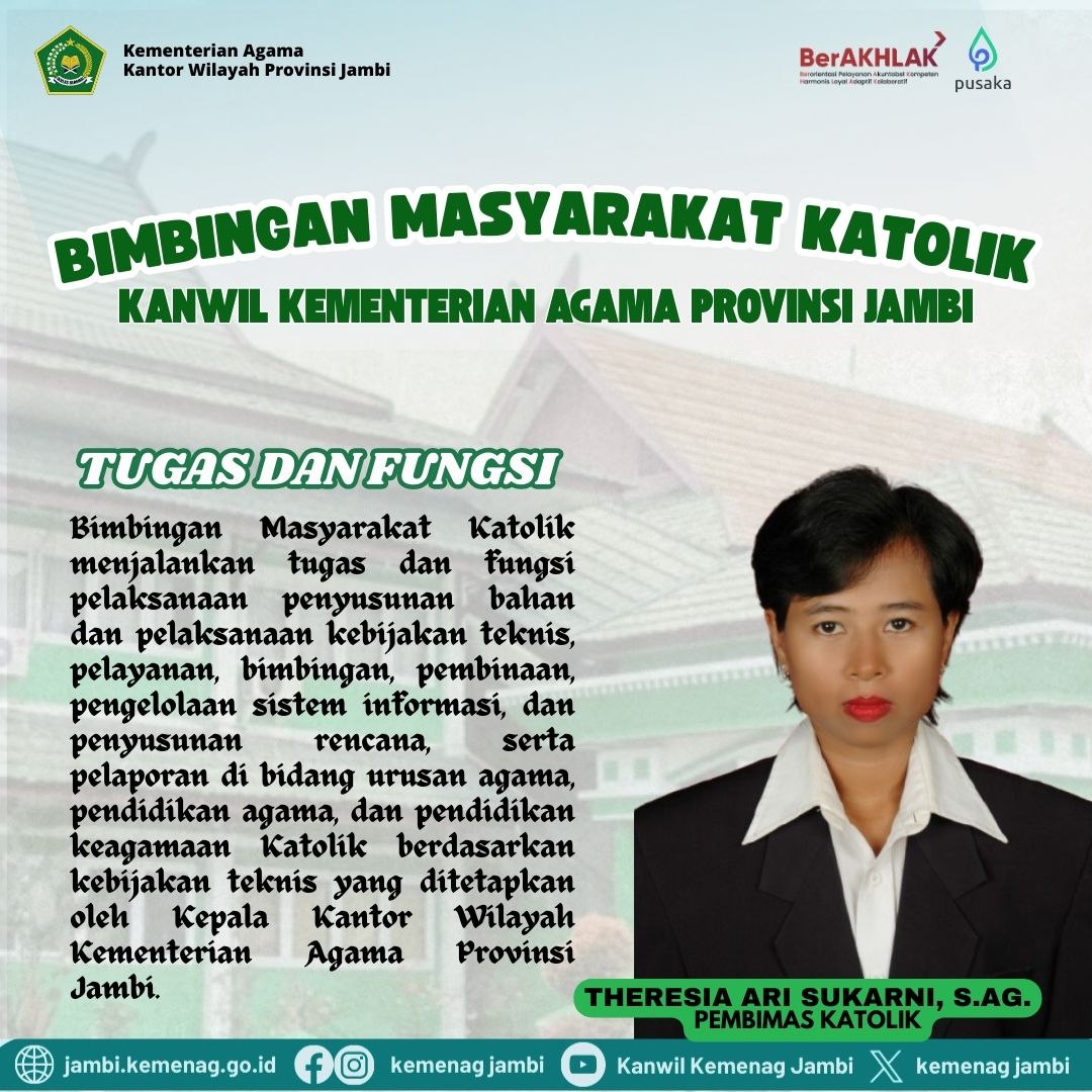 Melaksanakan penyusunan bahan dan pelaksanaan kebijakan teknis, pelayanan, bimbingan, pembinaan, pengelolaan sistem informasi, dan penyusunan rencana, serta pelaporan di bidang urusan agama, pendidikan agama, dan pendidikan keagamaan Katolik berdasarkan kebijakan teknis yang ditetapkan oleh Kepala Kantor Wilayah Kementerian Agama provinsi Jambi.
